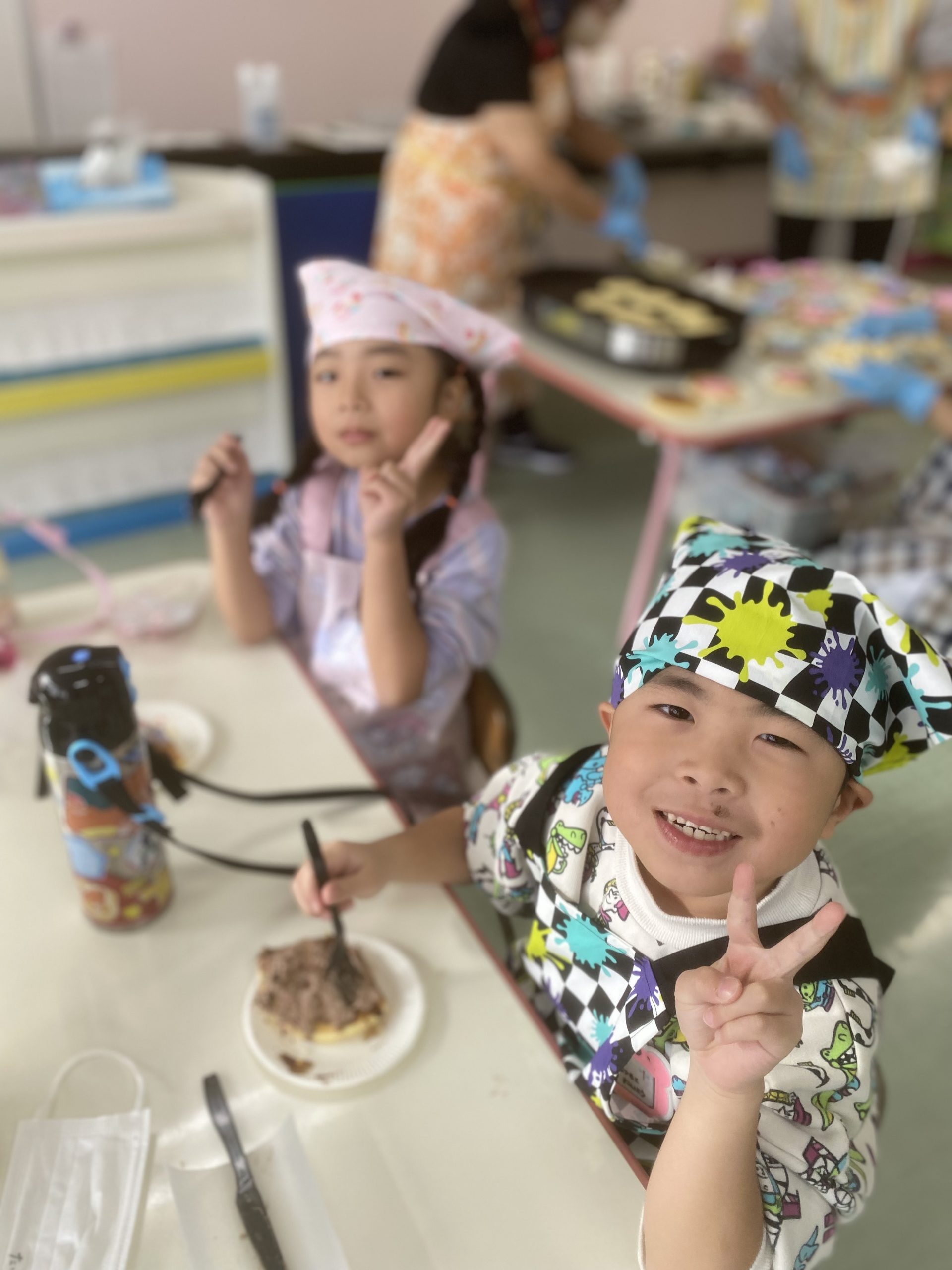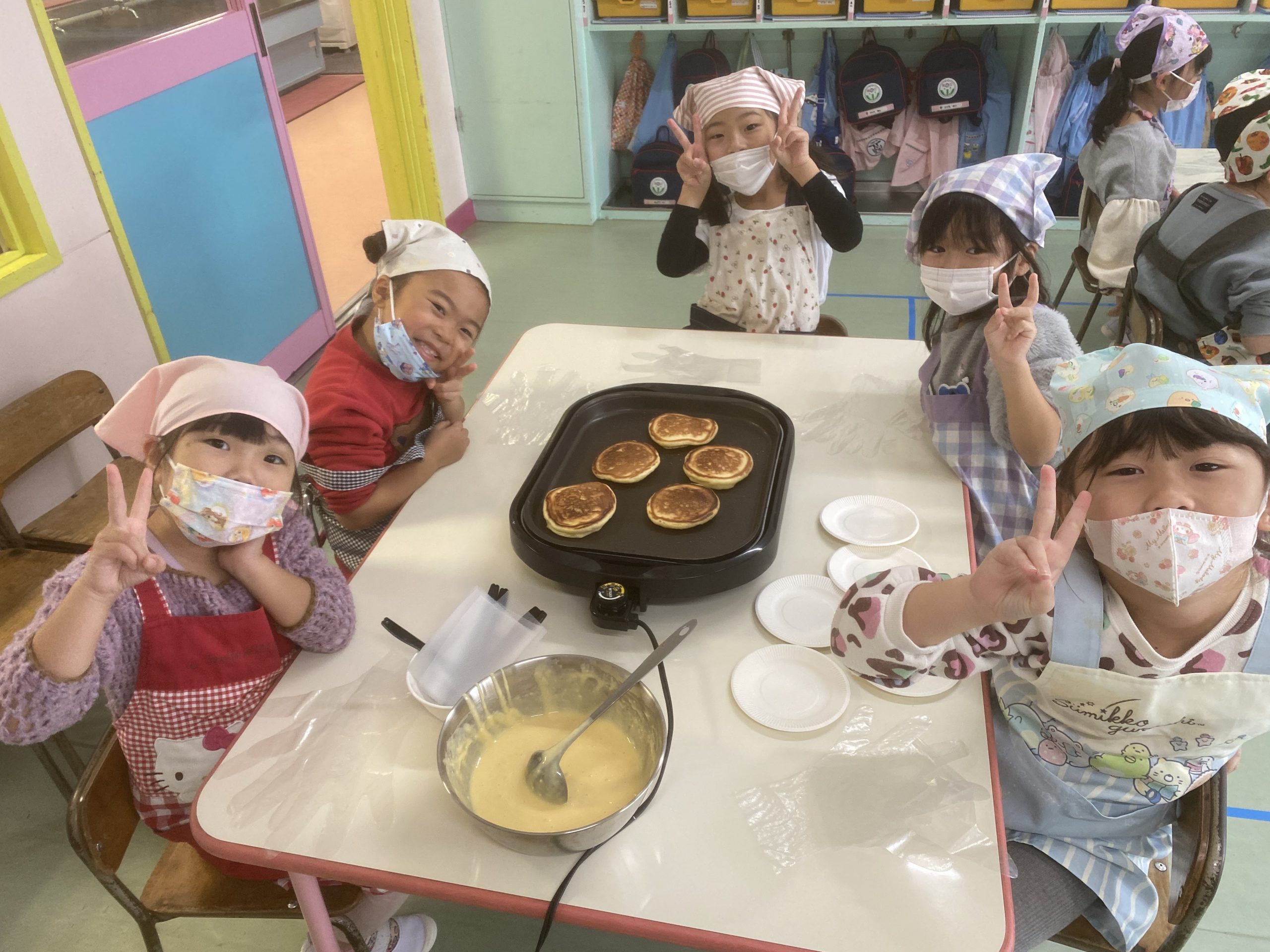 焼き上がりの良い香りが広がると「早く食べた~い」と気持ちが抑えきれず思わず顔を近づけてみている場面も。ホットケーキを焼いた後は生地のふくらみに気づいた子が「あ!ふっくらしてきたよ!」と大興奮。