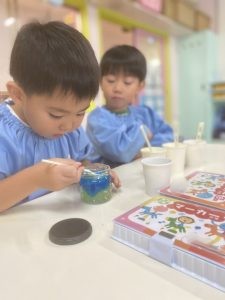 また別の日の色水実験では、色が混ざる瞬間に「見て~水色になった!」と予想外の変化にびっくりし、じ~っとのぞき込むお友だち。