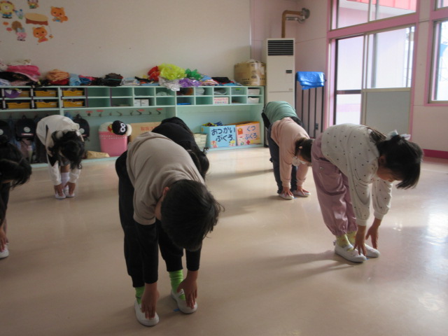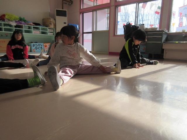 先生が「怪我をしないように体をゆっくりのばすよ~」と声をかけると「こんなに足開くよ」と自慢げに見せ合う姿も。