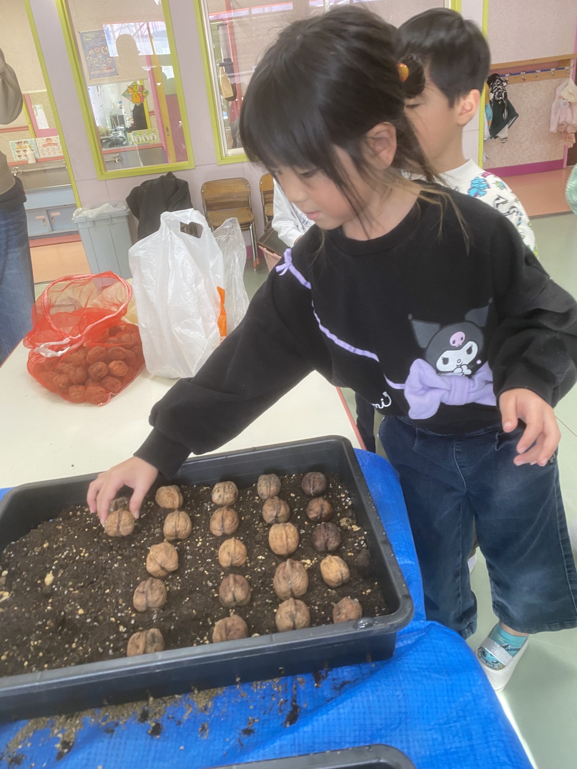 大人はくるみはリスさんが食べるというイメージがありますが、子どもたちは初めてくるみを見たという子が多かったようですね。