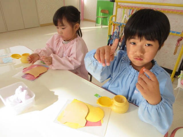 のりを手に付けて「みて、くっついたよ」とニコニコして見せてくれるお友だち、上手だね。