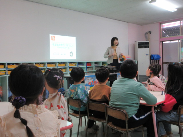 それから、市の職員さんが幼稚園に来てくれ、年長さんの子どもたちにお金の大切さや物を大切に使う心についてわかりやすくお話をしてくれました。